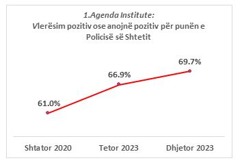 Rreth 69.7% e të anketuarve anojnë nga vlerësimi pozitiv për punën e Policisë së Shtetit në përgjithësi – 55.9% pozitiv dhe 13.8% anojnë pozitiv. Krahasuar me tre vjet më parë, regjistrohet një rritje e opinionit pozitiv me 8.7 pikë përqindje (shihni Grafikun 1).