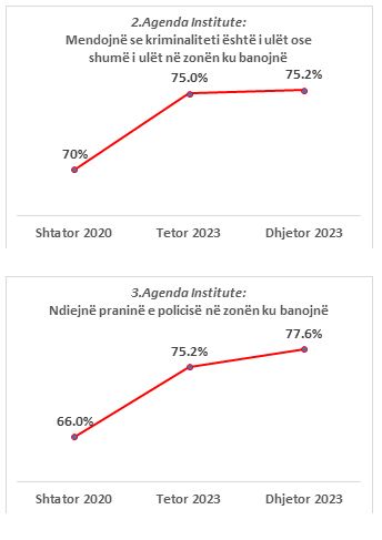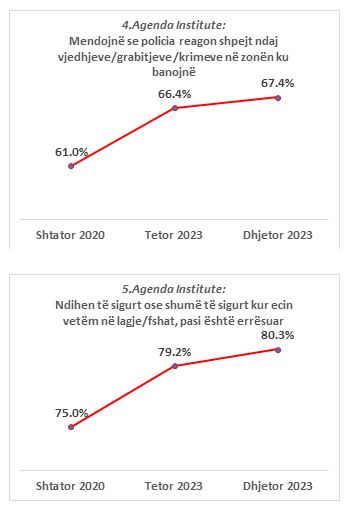 Rreth 67.4% e të anketuarve anojnë nga mendimi se policia reagon shpejt ndaj vjedhjeve/grabitjeve/krimeve në zonën ku banojnë. Krahasuar me tre vjet më parë, regjistrohet një rritje e animit pozitiv me 6.4 pikë përqindje (shihni Grafikun 4).