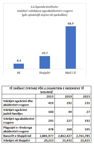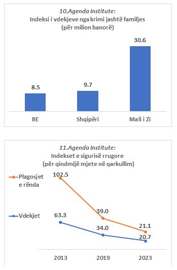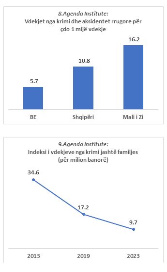 Raporti i vdekjeve nga krimi dhe aksidentet rrugore ndaj totalit të vdekjeve gjithsej në Shqipëri zbriti në 10.8 për mijë, nga 20.7 pë rmijë që ishte më 2013 (shihni Grafikun 7). Për këtë tregues, Shqipëria është afër BE-së, ndërsa Mali i Zi larg BE-së (shihni Grafikun 8).