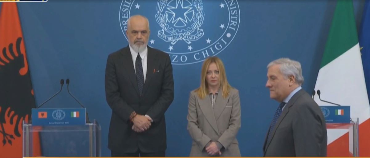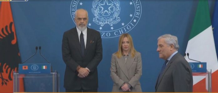 Kryeministrja italiane, Giorgia Meloni, në një konferencë të përbashkët me kryeministrin Rama, por për marrëveshjen për emigrantë.