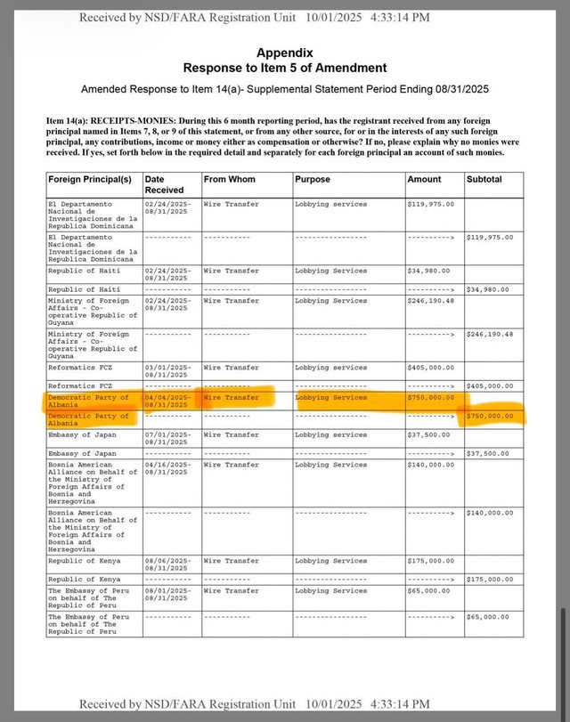 Sipas Evi Kokalarit, dokumentet e depozituara pranë FARA hedhin poshtë këtë version. Ajo thekson se në një deklarim të bërë më 1 dhjetor 2025 nga Continental Strategies rezulton se 750 mijë dollarë janë transferuar drejtpërdrejt nga Partia Demokratike e Shqipërisë për pagesën e shërbimeve lobuese.