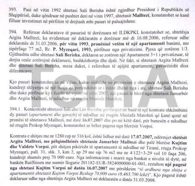 Sipas materialit hetimor, pas zgjedhjes së Sali Berishës President i Republikës në vitin 1992 dhe gjatë qëndrimit të tij në pushtet deri në vitin 1997, konstatohet nisja e investimeve në pasuri të paluajtshme nga familjarët Malltezi.