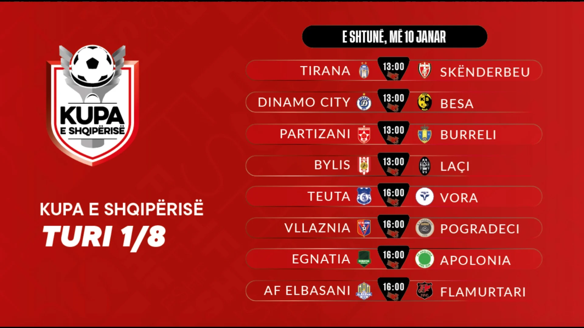 Viti 2026 në futbollin shqiptar do të nisë me Kupën e Shqipërisë. Këtë të shtunë do të luhen ndeshjet e fazës së 1/8 të finaleve të kompeticionit të cilat janë të ndara në dy fasha orare; në orën 13:00 dhe 16:00.