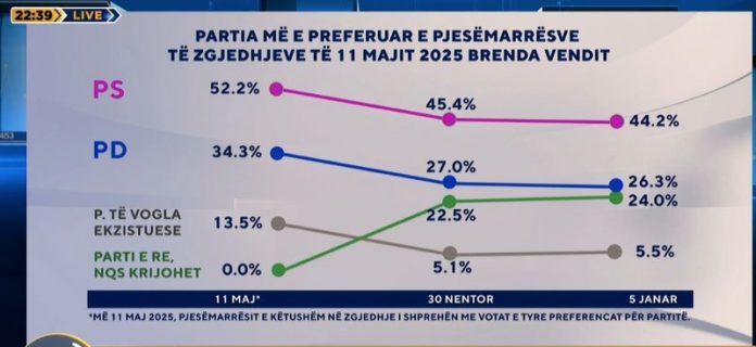 E njëjta rënie edhe për Partinë Demokratike me 8%, nga 34.3 në 26.3%, si dhe për partitë aktuale të vogla opozitare, nga 13.5% në 5.5%.