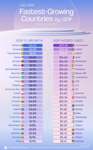 Shqipëria pritet të jetë një nga vendet me rritjen më të shpejtë të PBB-së për frymë në botë në vitet e ardhshme. Sipas një analize të publikuar nga Visual Capitalist, bazuar në të dhënat e Fondit Monetar Ndërkombëtar, vendi renditet i gjashti në nivel global për periudhën 2026-2030.