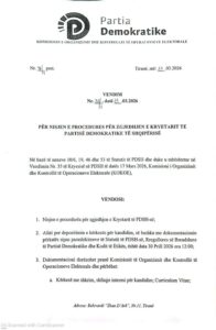 Vendimi është marrë nga Komisioni i Organizimit dhe Kontrollit të Operacioneve Elektorale (KOKOE), në mbështetje të Statutit të PDSH-së dhe të vendimit nr. 35 të Kryesisë së PD-së, të datës 17 mars 2026.
