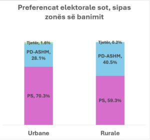 Kështu, në zgjedhjet e fundit parlamentare (11 maj 2025), pothuaj 40% e votave të këtushme të PD-së ishin në zona rurale, ndërkohë që as 35% e votave të PS-së nuk ishin në ato zona. Nga ana tjetër, mbi 65% e votave të këtushme të PS-së ishin në zona urbane. Dhe jo si dikur, zonat urbane kanë tani pothuaj dyfishin e popullsisë së zonave rurale…